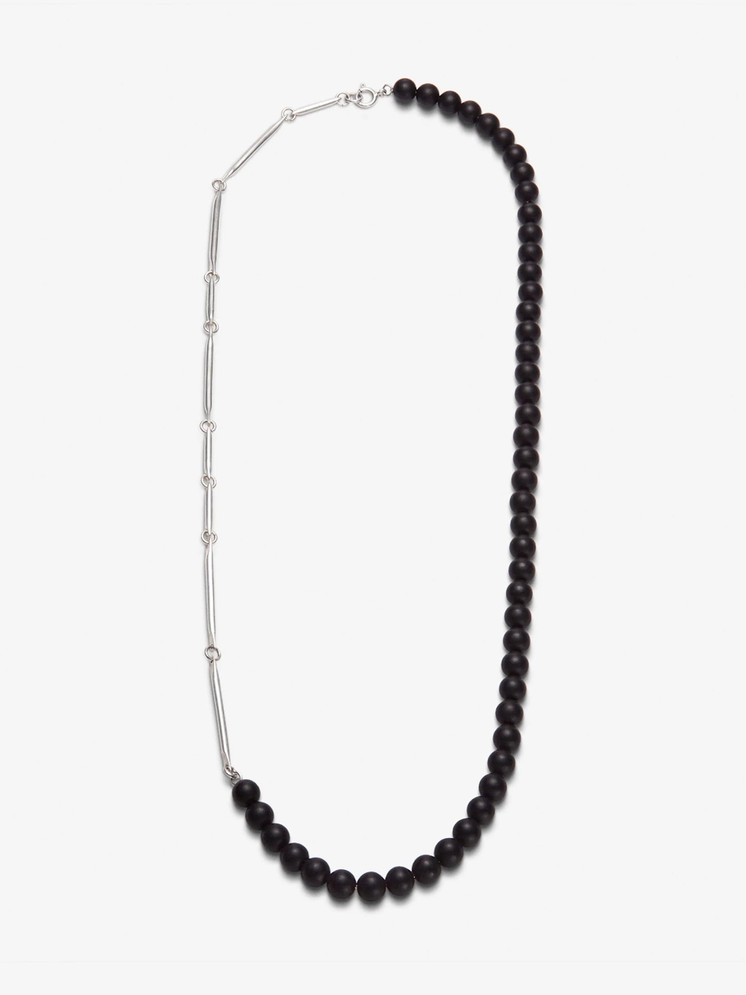 Half strand of smooth onyx beads paired with fine silver links. Balanced and sleek.