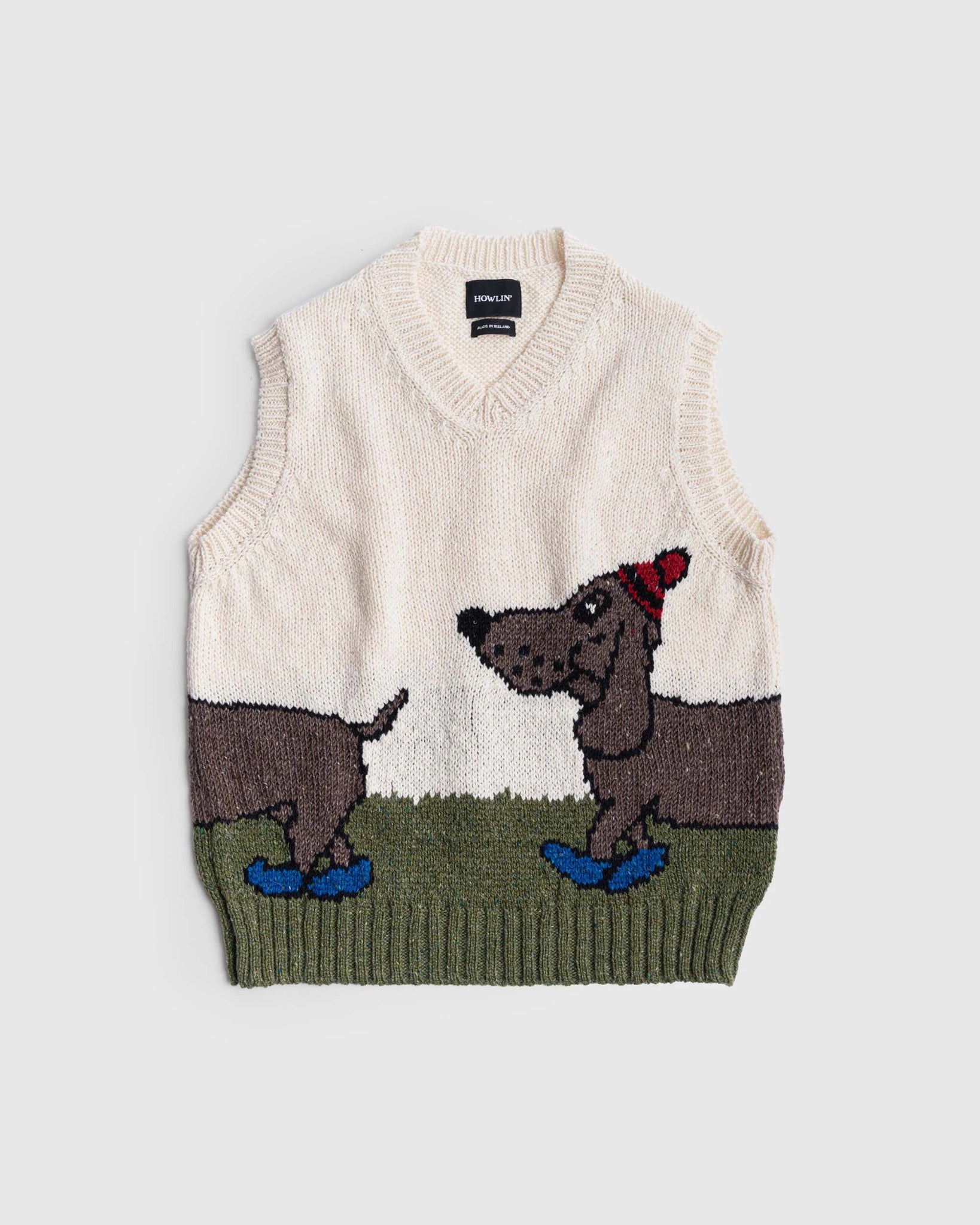 All I Can See Is My Bumper from Howlin’ brings fun and warmth in equal measure. Featuring a long, cartoon-style dachshund in blue booties and a red beanie, this V-neck slipover delivers knitwear done the Howlin' way.