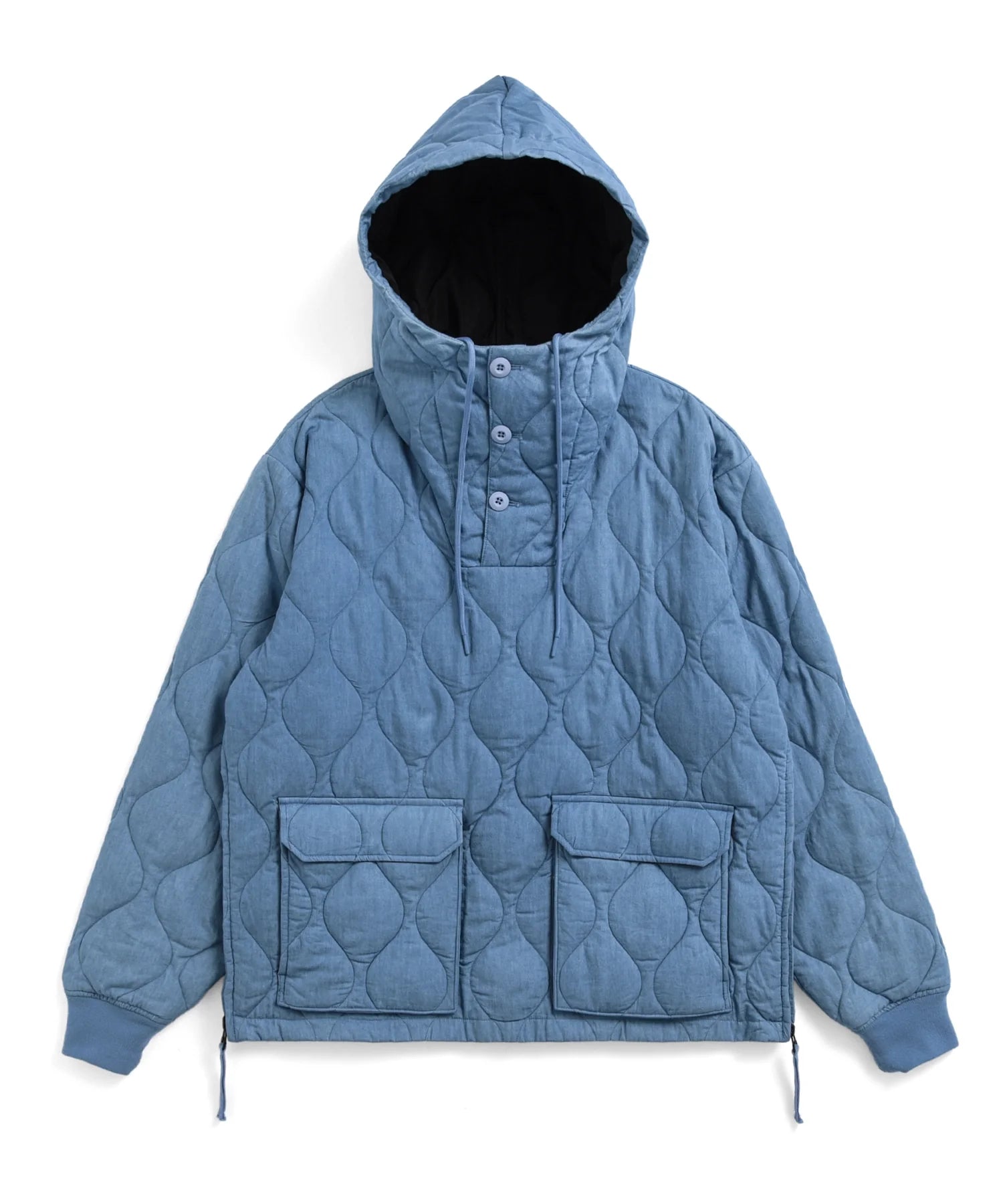 This military-inspired pullover down jacket features a distinctive hood design and a relaxed, oversized silhouette.