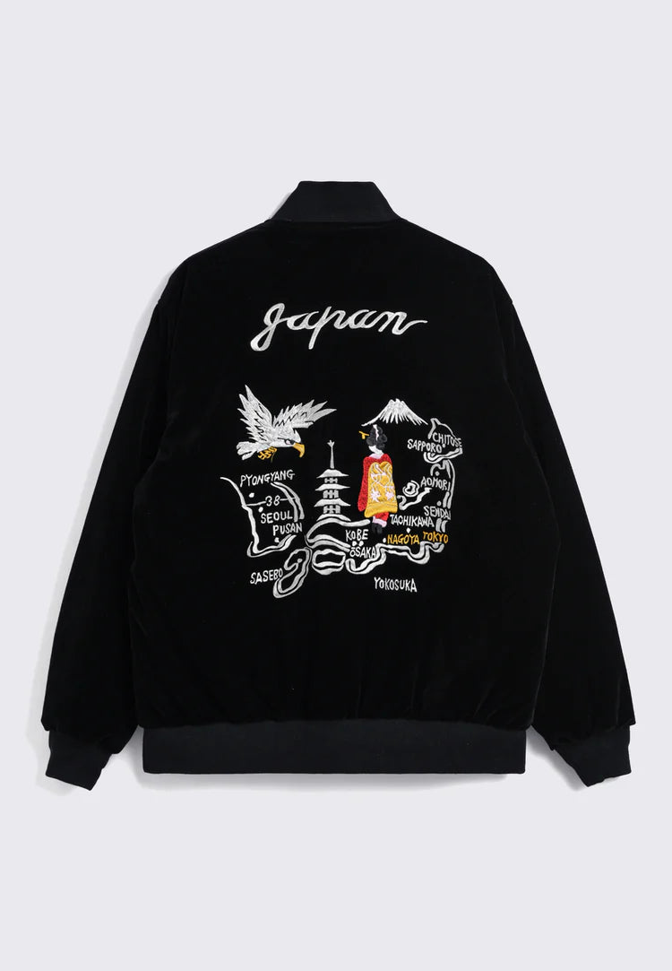 -The front side features Sukajan-style embroidery on the front and back of the velour fabric.
